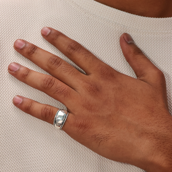 • Design & Appeal: Features a broad, polished band with a subtly hammered/molten central surface, framed by continuous milgrain or bead detailing. This bold, textured design appeals to customers seeking contemporary, stackable, statement, and gender-neutral jewelry.