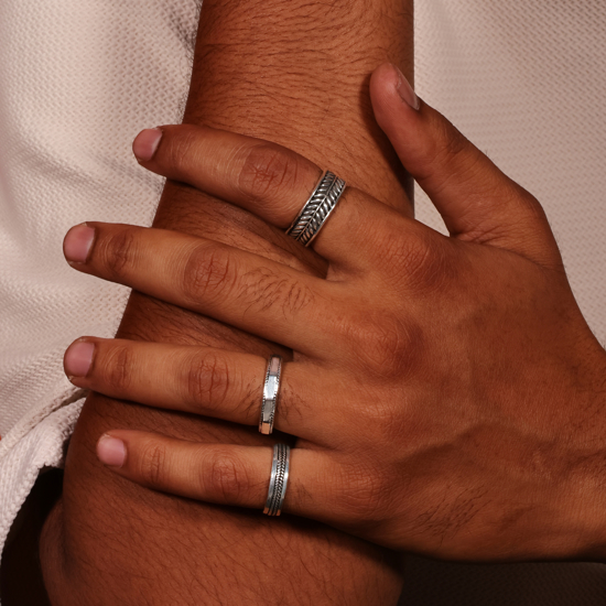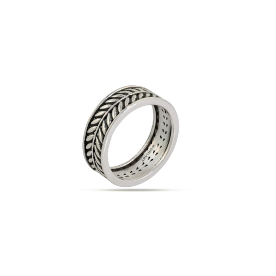 • Design & Appeal: Features a broad, substantial band with a continuous, repeating leaf or laurel wreath pattern. The design utilizes an oxidized (darkened) finish to emphasize the intricate texture. This heritage-inspired style appeals to customers seeking bohemian, textured, traditional, and meaningful everyday rings.