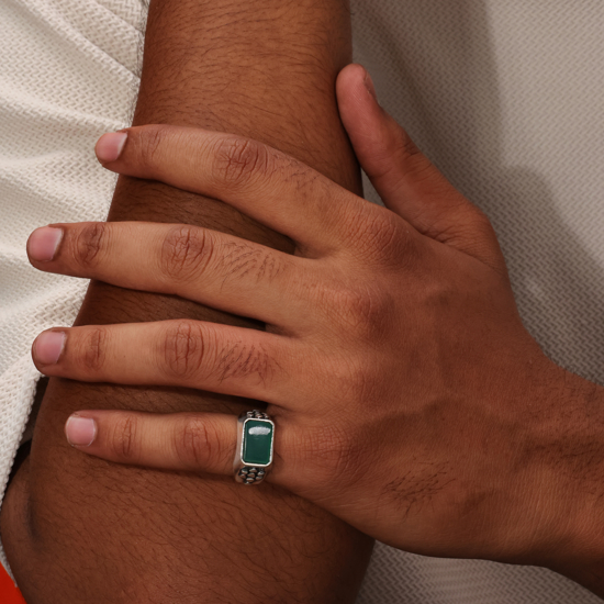 • Design & Appeal: Features a broad, polished band with decorative side detailing, centered by a prominent rectangular bezel-set stone. This classic signet style appeals to customers seeking traditional, bold, heritage, and customizable men's jewelry.