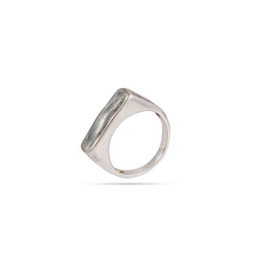• Design & Appeal: Features a prominent vertical bar top with a rough, organic, or "molten" texture, set on a coordinating band. The oxidised finish emphasizes the deep texture, lending an ancient or artifact-like quality. This bold design appeals to customers seeking artisan, sculptural, gothic, and highly textural statement jewelry.