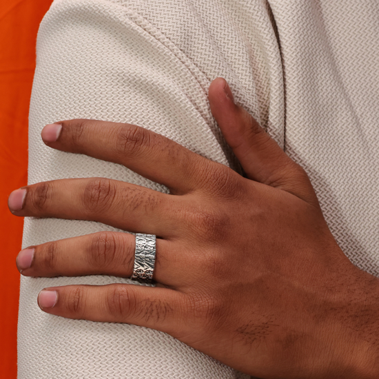 • Design & Appeal: Features a broad, open-back (adjustable) band with an intense, deeply textured, uneven surface. The prominent oxidised finish highlights the crevices, giving it a heritage/ancient artifact look. This unique style appeals to customers seeking bohemian, gothic, artisan, and textural statement jewelry.